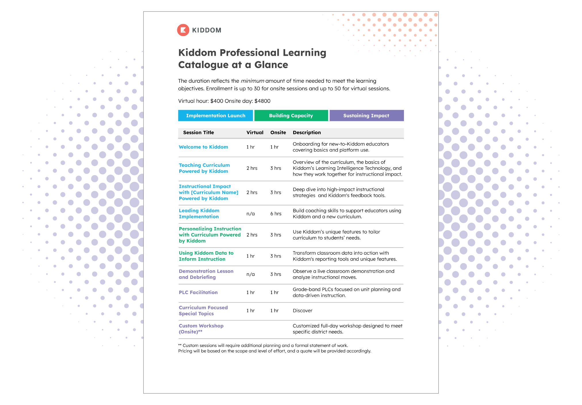 Explore our menu of options for implementing Kiddom IM® v.360 California. Remember, live chat and a dedicated customer support manager are always available to support you.